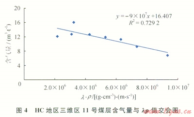 煤層含氣性預測的基礎是測井曲線分析。通過對研究區(qū)內(nèi)所收集到的井的含氣量與彈性參數(shù)交會分析(圖4)得到,該區(qū)11號煤層的含氣量隨密度、縱波速度、縱橫波速度比、lr值增大而減小,同時按線性關系擬合儲層含氣量與lr值之間的數(shù)學關系,相關系數(shù)為0.7292,認為兩者的線性關系有一定的可靠性,可以用lr值來指示含氣量的變化,lr小值對應含氣量的大值。