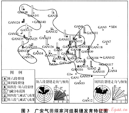 廣安氣田的須六段與須四段儲層總體上裂縫比較發(fā)育,在成像測井圖上[11],整個廣安構(gòu)造共有13口井發(fā)育裂縫(圖3),須四段與須六段的裂縫發(fā)育特征相似,裂縫走向主要有北西和北東向2組,中低傾角,發(fā)育井位多數(shù)重合,反映其可能在同一應(yīng)力場下形成。其中須六段裂縫主要發(fā)育在下亞段,共有9口井測井時發(fā)現(xiàn)裂縫,以低角度縫為主,部分發(fā)育水平縫和高角度縫,但氣藏分布范圍內(nèi)只有2口井(廣安105和廣安107井)發(fā)育裂縫,共發(fā)現(xiàn)5條張開裂縫,其余裂縫發(fā)育井均不在探明儲量范圍內(nèi)。因此須六段氣藏的主要儲集空間是孔隙,裂縫不是影響產(chǎn)能的主要因素。