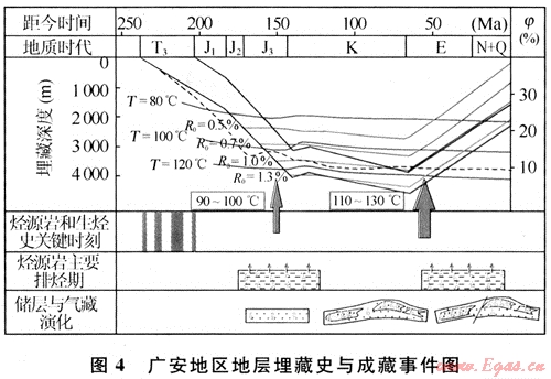 首先,根據(jù)廣安地區(qū)的埋藏與生烴史演化,晚侏羅世至早白堊世,地層溫度達到100~120℃,Ro達到了1.0%~1.3%,須家河組煤系源巖處于最大生烴期,并發(fā)生了排烴。但是,以煤系為主的烴源巖具有較強的吸附烴能力,吸附狀態(tài)的甲烷占55.83%~95.63%,成為甲烷在煤層中的主要儲存形式。等溫吸附實驗表明,當(dāng)?shù)貙訅毫档蜁r會有大量煤層氣發(fā)生脫吸附作用,成為游離氣,通過煤層割理或裂縫系統(tǒng)進入儲集層[15~16]。因此,在地層埋藏大量生烴過程中,烴源巖并沒有發(fā)生完全排烴,而是有很多烴類被吸附在煤系地層中,在后期的抬升降溫過程中發(fā)生大量排烴。