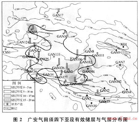 從廣安須四、須六段氣藏的平面與縱向分布特征可以看出,廣安氣田氣藏的分布范圍主要受有效儲層的控制,不受構(gòu)造起伏的影響,屬于巖性或構(gòu)造巖性氣藏。但構(gòu)造高點與有效儲層的配合可以提高產(chǎn)能。須六段氣藏雖然分布在廣安構(gòu)造高部位及其斜坡,主要與其有效儲層的分布范圍相一致,而有效儲層的形成主要受儲層沉積和成巖演化的控制。須四段氣藏的分布則基本不受構(gòu)造起伏的控制,由圖2可以看出,有效儲層同樣分布的東部是構(gòu)造高部位,但沒有氣層分布。而西部構(gòu)造地勢低洼,則是氣層分布的主要范圍。