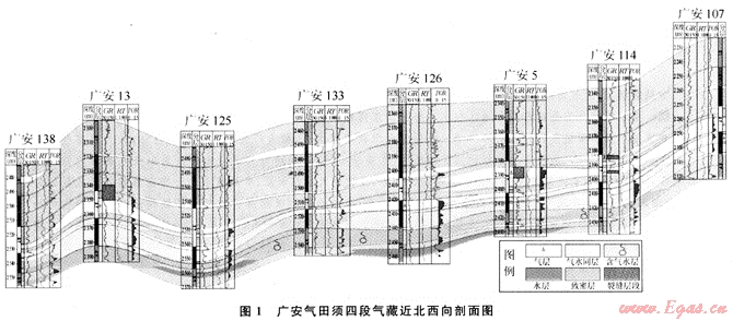廣安氣田含氣層系主要為須四段和須六段,其疊加起來的探明儲量超過了1300×108m3,含氣回積達到了800km2,但由于儲層低孔低滲,成巖作用強烈,導(dǎo)致儲層和致密砂巖間互分布[6~7]。致密砂巖的排替壓力高,成為氣藏內(nèi)部的分割層,從而將須四段和須六段氣藏在縱向和橫向上分割成數(shù)個小氣藏,它們相互獨立,具有不同的氣水和溫壓系統(tǒng),是川中地區(qū)大面積成藏的典型代表。