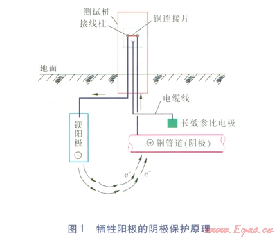 陰極保護分犧牲陽極陰極保護法和外加電流陰極保護法。綠博公司主管道采用的是犧牲陽極陰極保護法,其原理就是原電池的原理,是將一種比鐵更活潑的鎂陽極與被保護的鋼管相連接,通過鎂陽極的不斷氧化反應,向被保護的鋼管提供保護電子,使其獲得保護。犧牲陽極陰極保護原理見圖l。