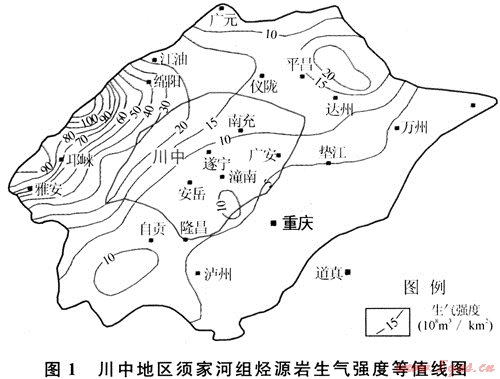 川中地區(qū)須家河組為一套自生自儲的氣藏,須一段、須三段、須五段暗色泥巖層夾煤層是主要烴源巖,源巖中有機(jī)質(zhì)極為豐富,具有形成大氣田的物質(zhì)基礎(chǔ);烴源巖厚度較大,暗色泥質(zhì)源巖厚度超過100m;烴源巖總厚度一般超過130m,局部地區(qū)大于300m,煤巖總厚度超過3m,具多層分布的特點(diǎn),部分井可達(dá)數(shù)層,煤巖單層厚度為0.2~1m;烴源巖有機(jī)碳豐度普遍較高,平均為1.76%,以腐殖型干酪根為主,川中地區(qū)發(fā)育最好的3套烴源以須五段最好,須三段次之,須一段厚度較薄。盡管川中地區(qū)每套烴源巖生氣強(qiáng)度偏低,平均生氣強(qiáng)度為12.1×108m3/km2(圖1),但其烴源巖厚度較大、有機(jī)質(zhì)含量高、分布范圍大、構(gòu)造平緩、中深埋藏、保存條件良好,為須二、須四、須六段天然氣富集成藏提供了豐富的物質(zhì)基礎(chǔ),具備形成大中型氣藏的氣源條件。