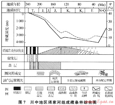 川中地區(qū)須家河組生、儲層在沉積后的地史中長期處于中深埋藏,古今構(gòu)造平緩,受力較弱,保存封閉條件良好,這為油氣的生存與油氣成藏富集提供了良好地質(zhì)條件。川中地區(qū)須家河組油氣成藏富集可劃分為3期(圖7):①晚侏羅世末為油氣初始排烴、運(yùn)聚成藏期,烴源巖處于生油氣早期階段,油氣垂向運(yùn)移到須家河組各孔隙性儲層內(nèi),同時烴源巖演化生成油氣時還產(chǎn)生一種有機(jī)酸,其對儲層的孔隙具有建設(shè)性改造作用(溶蝕作用),從而增加了砂巖儲集空間體積。由于儲層孔、滲條件得到改善,已形成的古圈閉所處的低勢環(huán)境能優(yōu)先捕獲這一時期的油氣并聚集成藏;②白堊紀(jì)-古近紀(jì)為油氣主要聚集成藏期,此時期烴源巖已進(jìn)入生油氣高峰,生成的油氣首先向就近儲集體中運(yùn)移,并與早期進(jìn)入儲層的油氣匯聚成藏;③喜山期以來為油氣成藏調(diào)整期,喜山運(yùn)動期間形成一系列新圈閉,并最終使圈閉定型,產(chǎn)生斷層及其伴生裂縫,烴類發(fā)生轉(zhuǎn)移、調(diào)整和再分配,這一成藏期為新圈閉捕獲油氣創(chuàng)造了條件。