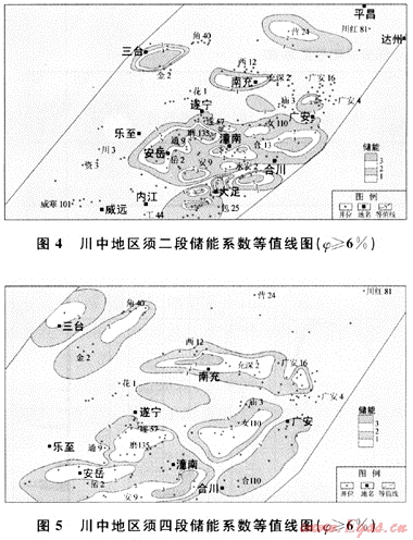 就須二段來看,高儲能系數(shù)分布區(qū)主要在金華-充西-營山構(gòu)造帶以及川中-川南過渡帶相對連續(xù)并具一定規(guī)模,如合川、潼南、遂南、磨溪區(qū)決(圖4);須四段高儲能系數(shù)區(qū)主要分布在川中西北部-廣安一帶、磨溪-潼南一帶(圖5);須六段高儲能系數(shù)區(qū)除主要分布在廣安Ⅰ號區(qū)塊,其他地區(qū)僅零星分布(圖6)。因此,須家河組各亞段高儲能系數(shù)分布范圍較大,具有較大勘探開發(fā)潛力。