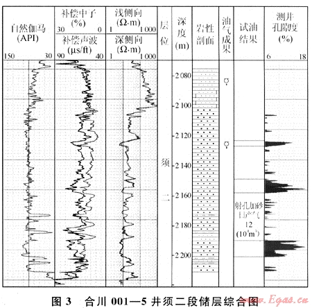 相對高孔儲層(φ≥8%)的發(fā)育是氣井獲得工業(yè)油氣的首要條件。如廣安須六段氣藏,高孔儲層相對發(fā)育,呈厚層塊狀,儲層平均孔隙度為9%~10%,此類井一般測試產(chǎn)量及投產(chǎn)效果均較好(圖2);而目前正在開發(fā)的合川須二段氣藏,儲層主要發(fā)育在須二段中下部,呈厚層塊狀,試油測試產(chǎn)量及投產(chǎn)效果均較好(圖3)。證明相對高孔儲層的發(fā)育是獲得工業(yè)油氣的首要條件。