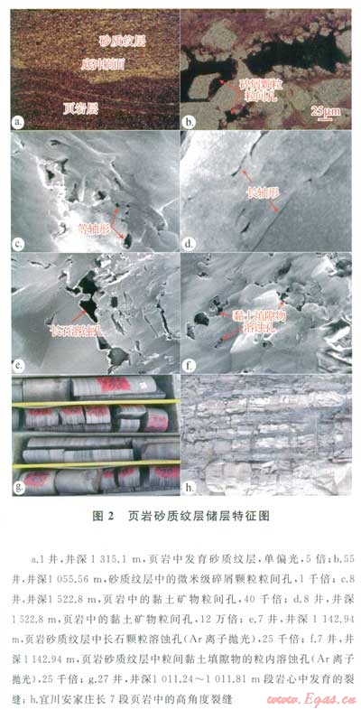 砂質(zhì)紋層廣泛發(fā)育原生粒間孔和次生溶蝕孔。原生粒間孔主要是碎屑顆粒粒間孔與黏土礦物粒間孔。碎屑顆粒粒間孔在砂質(zhì)紋層中極為常見,該類孔隙的孔隙形態(tài)多呈不規(guī)則的多邊形,直徑以微米級(jí)至幾十微米為主(大孔級(jí))(圖2-a、2-b)。黏土礦物粒間孔是黏土礦物(主要是伊利石與綠泥石)圄成的孔隙空間,掃描電鏡下常見長軸形和等軸形2種形態(tài)(圖2-c、2-d)。長軸形由于壓實(shí)的影響而呈“縫”狀,其孔徑大小可達(dá)數(shù)十納米(中孔級(jí)),一般沿黏土礦物層理呈定向分布;等軸形是黏土礦物顆粒在強(qiáng)水動(dòng)力環(huán)境堆積而成的粒間孔,或者是黏土絮凝物在靜水環(huán)境殘留下來的殘余孔(一般為大孔級(jí)),分布較雜亂。次生溶蝕孔一般發(fā)育在長石及碎屑顆粒的粒間填隙物內(nèi)(圖2-c、2-f),包括粒間孔、粒內(nèi)孔和鑄???,以粒間孔為主。粒間孔形態(tài)各異,常見港灣狀溶蝕邊緣,直徑以數(shù)十至數(shù)百納米為主(中孔級(jí));粒內(nèi)孔多納米級(jí)(小孔級(jí));鑄??装w粒間易溶物鑄模和顆粒鑄模,孔徑變化較大。砂質(zhì)紋層還發(fā)育構(gòu)造裂縫,裂縫面比較粗糙,以高角度縫為主,產(chǎn)狀不穩(wěn)定(圖2-g、2-h)。