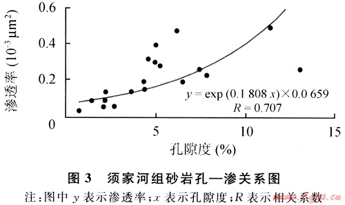 據(jù)野外剖面20個樣品的孔隙度和滲透率分析數(shù)據(jù)統(tǒng)計[6],須家河組砂巖孔隙度為0.7%~24.08%,主要分布范圍為2%~8%,不計最大和最小值,平均為5.26%;滲透率為0.025×10-3~25.22×10-3μm2,主要集中在0.1×10-3~0.5×10-3μm2之間,不計最大和最小值,平均為0.219×10-3μm2,屬于低孔低滲型儲層。從圖3的孔-滲關(guān)系圖中,可進一步看出,須家河組砂巖的孔隙度與滲透率之間存在較明顯的非線性正相關(guān)關(guān)系,說明滲透率變化主要受孔隙發(fā)育程度控制。