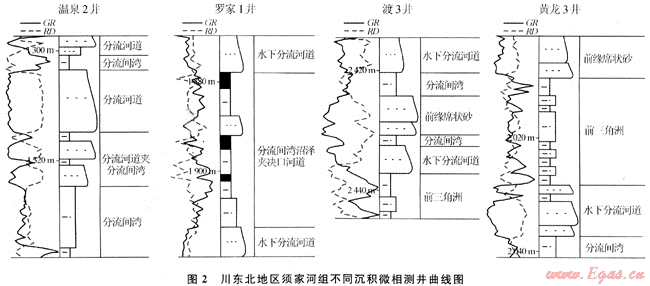 分流間灣是指分流河道之間與湖相通的相對低凹地區(qū),沉積物主要為泥質(zhì),含少量粉砂和細砂,尤以水下堤泛沉積的巖性組合特征明顯受層位控制為顯著特點。如須家河組以沉積暗色的泥、粉砂巖為主,頻繁夾有碳質(zhì)泥、頁巖和煤層、煤線,大多數(shù)泥巖富含有機碳組分而呈深灰-灰黑色,反映溫暖潮濕氣候和還原環(huán)境,有利于烴源的發(fā)育,自然伽馬、自然電位多表現(xiàn)為高值,視電阻率曲線表現(xiàn)為偏低阻。曲線形態(tài)沒有固定規(guī)律,多為負箱形、指狀、鋸齒形疊合(圖2)。