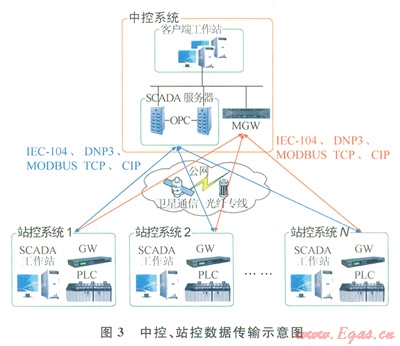 另一種方式是,中控系統(tǒng)通過MGW使用IEC-104、DNP3、MODBUS TCP、CIP等協(xié)議實現(xiàn)對所有站控系統(tǒng)的數(shù)據(jù)采集和控制指令下發(fā)。