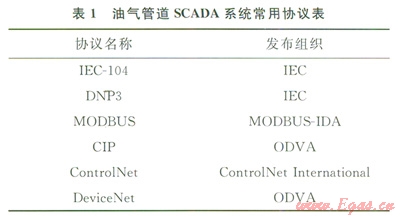SCADA數(shù)據(jù)傳輸使用的通信協(xié)議,應能保證數(shù)據(jù)在限定時間內(nèi)正確送達。根據(jù)美國燃氣協(xié)會(AGA)發(fā)布的AGA-12:1標準[6],SCADA系統(tǒng)中使用的協(xié)議有近200個,大都是由不同廠商研發(fā)提供的私有協(xié)議。經(jīng)過多年的發(fā)展,一些開放的標準協(xié)議在工業(yè)界得到廣泛應用。表1中列舉了油氣管道SCADA系統(tǒng)中最常用的幾種標準協(xié)議。