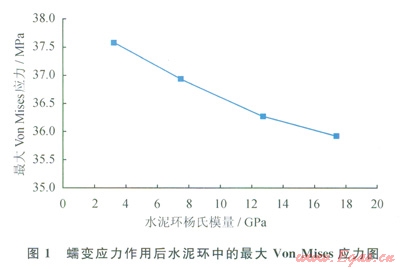 由圖l可以看出,水泥環(huán)中的最大Von Mises應(yīng)力隨水泥環(huán)楊氏模量的增大而減小,這與將蠕變地應(yīng)力施加于地層外側(cè)時的研究結(jié)果相反[21];最大von Mises應(yīng)力在35.8~37.6MPa的范圍內(nèi),大于水泥環(huán)的抗壓強度。因此水泥環(huán)會發(fā)生屈服破壞。為了預(yù)防水泥的屈服破壞,需要增大水泥環(huán)的楊氏模量以降低水泥環(huán)中的最大Von Mises應(yīng)力,且確保水泥環(huán)的抗壓強度大于最大Von Mises應(yīng)力。