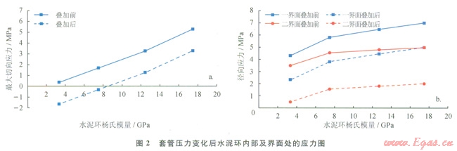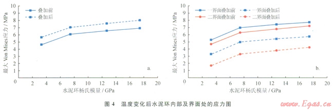 由圖4-a圖看出,水泥環(huán)內(nèi)的最大Von Miscs應(yīng)力隨水泥環(huán)楊氏模量的增大而增大;與初始應(yīng)力替加后,Von Mises應(yīng)力增大為4.4~8.0MPa,小于普通水泥環(huán)的屈服強度。所以,當(dāng)溫度變化幅度不大時,水泥環(huán)通常不會發(fā)生屈服破壞,但溫度升高幅度較大時水泥環(huán)可能會發(fā)生屈服破壞。因此,對熱采井等應(yīng)避免使用膨脹水泥漿,且應(yīng)使用低楊氏模量的水泥環(huán)。由圖4-b可以看出,與初始應(yīng)力疊加前,一、二界面在徑向上受拉伸應(yīng)力的作用且應(yīng)力隨水泥環(huán)的楊氏模量增大而增大,為4.4~8.0MPa,遠大于一、二界面膠結(jié)的抗拉強度,會破壞一、二界面膠結(jié);與初始應(yīng)力疊加后,徑向應(yīng)力顯著降低至1.4~6.0MPa,降低了一、二界面膠結(jié)破壞的風(fēng)險。因此,通過降低水泥環(huán)楊氏模量和增大初始應(yīng)力都可以降低界面膠結(jié)破壞的風(fēng)險,建議采用較低楊氏模量的水泥環(huán)或使用膨脹水泥來預(yù)防失效。