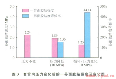 按照本文參考文獻[20]的方法制作固井封固系統(tǒng)模型,測試套管內(nèi)壓力變化對界面剪切膠結(jié)強度的影響。模型l制作完成后,模擬套管內(nèi)壓力不變的情況;模型2制作完成后,模擬套管內(nèi)壓力降低10MPa的情況;模型3制作完成后,模擬套管內(nèi)壓力循環(huán)變化的情況,變化幅度為l0MPa。測量并計算上述封固系統(tǒng)模型的一界面膠結(jié)強度,并分別以套管內(nèi)壓力不變時的一組模型的界面膠結(jié)強度為標準,計算分析套管內(nèi)壓力變化時的一界面膠結(jié)強度變化(圖3)。