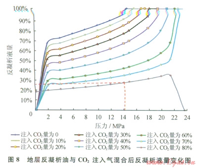 圖8表明:注入CO2后混合物體系液相體積減小,注入CO2所占摩爾含量越高,液相體積減小越多。當CO2注入氣摩爾含量達到80%時,在14.12MPa壓力下反凝析油液量體積收縮了約71%。而且,當CO2注入氣摩爾含量在70%~80%時,反凝析液量曲線出現(xiàn)了突變,反凝析液量變化趨勢由隨著壓力下降逐漸減小變化為隨著壓力下降先增加后減小的趨勢,表明當CO2注入氣摩爾含量達到80%時,反凝析油逐漸從輕質(zhì)凝析油體系轉(zhuǎn)變?yōu)閱蜗嗄鰵怏w系,這與圖6得出的結(jié)論一致,即當CO2注入氣摩爾含量達到78.6%時,CO2與地層反凝析油達到一次接觸混相,混相壓力為23.54MPa。綜合考慮該近臨界凝析氣藏地露壓差較大,目前該凝析氣藏的地層壓力下降較快,地層反凝析現(xiàn)象嚴重,有必要采取注氣的增產(chǎn)措施,降低凝析油的飽和度,有利于該凝析氣藏的高效開發(fā)。