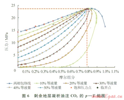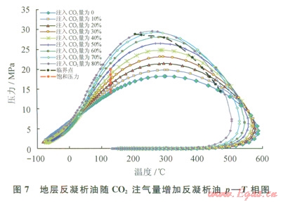 4)注氣膨脹實驗結(jié)果表明:隨著CO2注氣量增 加,凝析油飽和壓力升高。注氣膨脹模擬結(jié)果表明:隨著CO2注氣量增加,臨界點從右向左偏移,臨界溫度降低,臨界壓力增加,注CO2后混合物體系相圖向輕質(zhì)化特征轉(zhuǎn)變(向左收縮變窄)。而且,注入CO2后混合物體系液相體積減小,注入CO2所占摩爾含量越高,液相體積減小越多。