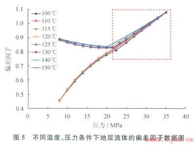HC近臨界凝析氣藏的儲層溫度和壓力分別為130℃、35.2MPa。因此,為了研究該儲層流體樣品的相態(tài)變化特征,筆者選取了在溫度100~150℃、壓力8~35.2MPa的范圍內(nèi)進行等組成膨脹實驗研究,以研究該近臨界流體樣品在超臨界區(qū)和近臨界區(qū)的泡點或露點壓力、偏差因子、反凝析液量以及p-T相圖的變化規(guī)律。通過實驗觀測到,溫度在120~125℃之間,近臨界溫度附近,很難觀測到第一個液滴或第一個氣泡,筆者把出現(xiàn)霧的壓力點暫且看作飽和壓力,并結(jié)合常規(guī)油氣藏相態(tài)實驗中得出的液相體積在泡點壓力以下減少,在露點壓力以下增加結(jié)論,綜合判斷該點是泡點壓力還是露點壓力。從圖3可以看出:在120~125℃之間液相體積也從泡點壓力以下迅速減少的趨勢,變?yōu)槁饵c壓力以下迅速增加的趨勢。所以,得出儲層的臨界溫度點在120~125℃之間,然后,利用CMG相態(tài)模擬軟件中1978年改進的PR狀態(tài)方程擬合實測的泡點或露點壓力,并得到完整的p-T相圖(圖4),并得到臨界點為l21.66℃、21.87MPa。不同溫度、壓力條件下地層流體的偏差因子如圖5所示。圖5虛線區(qū)域(100~150℃、大于21MPa)表明,此區(qū)域內(nèi)地層流體的偏差因子變化較??;溫度在100~150℃之間、壓力小于21MPa的條件下,偏差因子值發(fā)生了突變,臨界點處偏差因子值相等。而且,該地層流體所處的地層溫度、壓力點(130℃、35.2MPa)位于臨界點的右側(cè),且C7+的摩爾含量為l0.276%,可以判斷該流體樣品屬于近臨界超臨界態(tài)凝析氣藏。