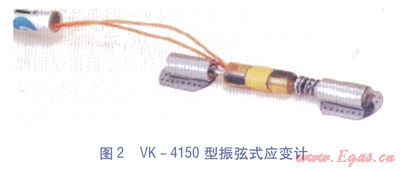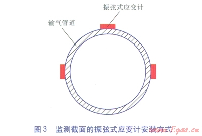 目前國(guó)內(nèi)外比較先進(jìn)的管道應(yīng)變傳感器主要包括振弦式應(yīng)變計(jì)、FBG光纖光柵應(yīng)變計(jì)、GFRP分布式應(yīng)變傳感光纜。VK-4150型振弦式應(yīng)變計(jì)見(jiàn)圖2。監(jiān)測(cè)截面的振弦式應(yīng)變計(jì)安裝方式見(jiàn)圖3。監(jiān)測(cè)截面指輸氣管道上安裝了振弦式應(yīng)變計(jì)的一個(gè)受測(cè)截面,每個(gè)監(jiān)測(cè)截面安裝3支振弦式應(yīng)變計(jì),呈品字形安裝的3支振弦式應(yīng)變計(jì)足以計(jì)算出管道在該截面圓周上任意一點(diǎn)的應(yīng)變量。沿管道軸向間隔20m左右設(shè)1個(gè)監(jiān)測(cè)截面,一個(gè)監(jiān)測(cè)截面的造價(jià)約1.5×104元。