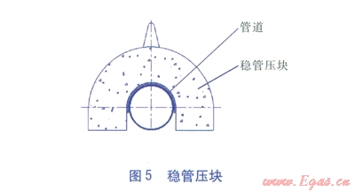 管道穿越濕陷性黃土沖溝溝底時通常采取兩種敷設(shè)形式:第一種形式是管道直接在溝底敷設(shè),在管道上采取穩(wěn)管壓塊(見圖5)、護岸、護底措施;第二種形式是跨越,即在放坡后的坡面,選取一個地質(zhì)條件較為穩(wěn)定的位置,設(shè)置跨越基墩,管道跨過沖溝。