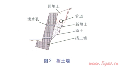 a.如果地貌允許(如荒地),首先進行分階削方處理,使管道通過處的坡度≤30°;其次在有可能產(chǎn)生積水或高跌水的位置,考慮設(shè)置漿砌塊石截水墻(見圖l)、排水溝,將水疏導(dǎo)至遠(yuǎn)離管道的地方,避免出現(xiàn)漏斗、溶洞以及對管溝產(chǎn)生沖蝕。