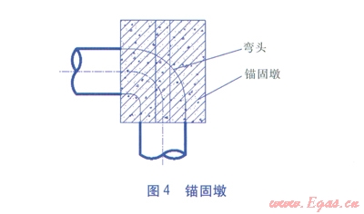 c.無論按照上述a或b哪種情況處理后,都還需要根據(jù)坡長及管徑設(shè)置錨固墩(見圖4),一般坡長>25m時,坡腳用素混凝土或灰土墩將彎頭錨固,坡長>35m時,除下部彎頭錨固以外,陡坡上每隔15~20m采用錨桿固定,錨桿深度應(yīng)在原土或基巖中。