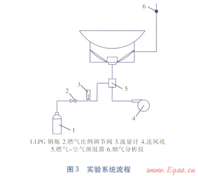 新型炒菜灶與傳統(tǒng)炒菜灶的實(shí)驗(yàn)系統(tǒng)基本一致。實(shí)驗(yàn)裝置包括LPG鋼瓶、煙氣分析儀、燃?xì)獗壤{(diào)節(jié)閥、流量計、電子溫度計等。煙氣分析儀用于測量煙氣中CO體積分?jǐn)?shù),燃?xì)獗壤{(diào)節(jié)閥用于調(diào)節(jié)控制LPG的流量,流量計用于計量LPG累計流量。實(shí)驗(yàn)系統(tǒng)流程見圖3。