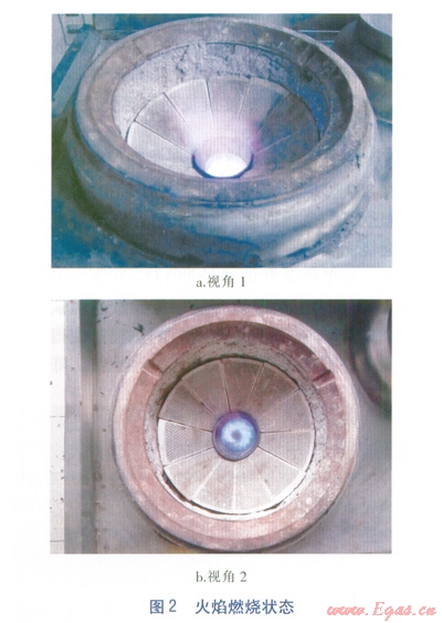 新型炒菜灶的結(jié)構(gòu)見圖1,火焰燃燒狀態(tài)見圖2。主要由燃?xì)庖豢諝忸A(yù)混器、灶具本體、燃燒器、扇形多孔聚能陶瓷板、送風(fēng)機(jī)等組成。燃燒器的內(nèi)壁開有能使可燃混合氣旋流噴出的旋流火孔,方向?yàn)檩S向順時針傾斜15°并且切向傾斜向上15°,孔徑為2.5mm。