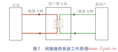 圖2中,一級(jí)熱力管網(wǎng)的高溫水和二級(jí)熱力管網(wǎng)的低溫水在用戶熱力站經(jīng)過換熱器間接換熱后供給熱用戶。而混水系統(tǒng)中(見圖l),一級(jí)熱力管網(wǎng)的高溫水和二級(jí)熱力管網(wǎng)的低溫水在用戶熱力站不經(jīng)過換熱器,而是直接混合后供給熱用戶。與間接換熱系統(tǒng)相比,混水系統(tǒng)更容易因?yàn)樗疁氐耐蝗簧叨a(chǎn)生氣體。