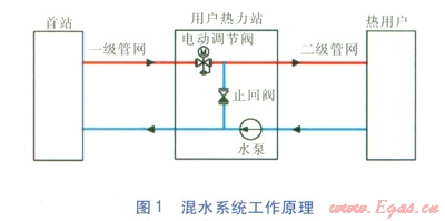隨著能源和環(huán)境問題日益突出,節(jié)能和環(huán)保引起全球關(guān)注,成為人類社會(huì)生存和發(fā)展的兩大主題?;焖到y(tǒng)作為一種更加節(jié)能的供熱方案,得到了日益廣泛的應(yīng)用?;焖到y(tǒng)工作原理見圖1,將一級(jí)管網(wǎng)的高溫水和二級(jí)管網(wǎng)的低溫水在用戶熱力站不經(jīng)過換熱器按比例直接混合后供給熱用戶。