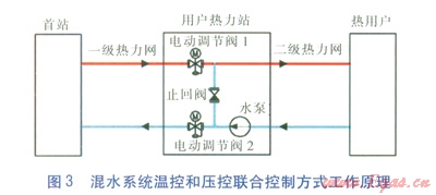 混水系統(tǒng)溫控和壓控聯(lián)合控制方式工作原理見圖3,在一級(jí)熱力管網(wǎng)供水管上設(shè)置壓力控制的電動(dòng)調(diào)節(jié)閥1,在一級(jí)熱力管網(wǎng)回水管上設(shè)置溫度控制的電動(dòng)調(diào)節(jié)閥2。壓力控制是通過檢測二級(jí)熱力管網(wǎng)回水壓力,來調(diào)節(jié)一級(jí)熱力管網(wǎng)供水管上的電動(dòng)調(diào)節(jié)閥1開度,使二級(jí)熱力管網(wǎng)回水壓力滿足所供小區(qū)基本的定壓要求。當(dāng)二級(jí)熱力管網(wǎng)的回水壓力低于該用戶熱力站所需的定壓值時(shí),電動(dòng)調(diào)節(jié)閥1開度增大;當(dāng)二級(jí)熱力管網(wǎng)的回水壓力高于該用戶熱力站所需的定壓值時(shí),電動(dòng)調(diào)節(jié)閥1開度減小。溫度控制的電動(dòng)調(diào)節(jié)閥2通過檢測二級(jí)熱力管網(wǎng)供水溫度是否滿足設(shè)定值來調(diào)節(jié)開度,當(dāng)二級(jí)熱力管網(wǎng)的供水溫度低于設(shè)定值時(shí),增大電動(dòng)調(diào)節(jié)閥2開度;反之,減小電動(dòng)調(diào)節(jié)閥2開度。通過溫控和壓控聯(lián)合控制的方式,一方面穩(wěn)定了混水系統(tǒng)的壓力,杜絕氣體由于壓力波動(dòng)而析出;另一方面也滿足了溫度控制的要求。