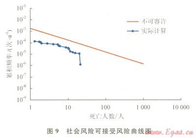 歐美等一些國家和石油天然氣企業(yè)已經(jīng)建立有自己的風(fēng)險(xiǎn)可接受標(biāo)準(zhǔn)。我國于2011年國家安全生產(chǎn)監(jiān)督管理總局頒布了《危險(xiǎn)化學(xué)品重大危險(xiǎn)源監(jiān)督管理暫行規(guī)定》,制定了危險(xiǎn)化學(xué)品重大危險(xiǎn)源的風(fēng)險(xiǎn)可接受標(biāo)準(zhǔn),除此以外沒有一個(gè)統(tǒng)一的或行業(yè)的風(fēng)險(xiǎn)可接受標(biāo)準(zhǔn)。因此,筆者所在公司自2009年就開展了高含硫氣田開發(fā)風(fēng)險(xiǎn)可接受標(biāo)準(zhǔn)的研究,并提出了公眾個(gè)人風(fēng)險(xiǎn)標(biāo)準(zhǔn)(0.8×10-4),員工個(gè)人風(fēng)險(xiǎn)(1.5×10-3)和社會風(fēng)險(xiǎn)[1.4×10-3(N=1),斜率取-1]基準(zhǔn)值以供參考。