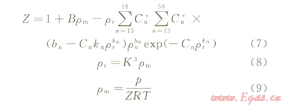 式中Z為天然氣壓縮因子;B為第二維利系數(shù);rm為摩爾密度(單位體積的摩爾數(shù));rr為對(duì)比密度;bn、Cn、kn為常數(shù);Cn*為溫度與組成函數(shù)的系數(shù);K為混合物體積參數(shù);R為氣體摩爾常數(shù)。