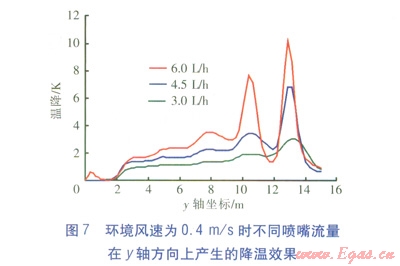 在環(huán)境風(fēng)速為0.4m/s,噴霧壓力為6MPa的條件下,增加單個噴嘴的流量進(jìn)行模擬,對比3種噴嘴流量(3.0、4.5、6.0L/h)下,x=4m截面上。z=1.5m處在y軸方向上產(chǎn)生的降溫效果,見圖7。