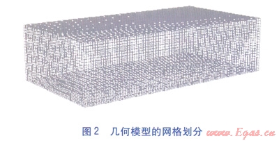 本文討論室外開敞空間應(yīng)用噴霧降溫的情況。室外開敞空間噴霧降溫的幾何模型長×寬×高為15m×8m×4m,見圖1。模擬地點(diǎn)為重慶市,夏季連晴高溫天氣期間,建筑密集區(qū)等局部地區(qū)最高室外溫度常達(dá)40~44℃,給人們生產(chǎn)、生活造成影響。因此,參考夏季連晴高溫天氣期間的氣象條件,設(shè)置數(shù)值模擬的初始條件為:室外空氣溫度為40℃,相對濕度為26%;地面設(shè)置為壁面,溫度為47℃;空氣入口為速度入口,環(huán)境風(fēng)速分別設(shè)為0.1、0.2、0.4m/s,流動方向?yàn)?/span>y軸正方向;兩側(cè)面為壓力入口,上表面及空氣出口為壓力出口。網(wǎng)格劃分采用規(guī)則的六面體網(wǎng)格形式,網(wǎng)格數(shù)6×104個,見圖2。