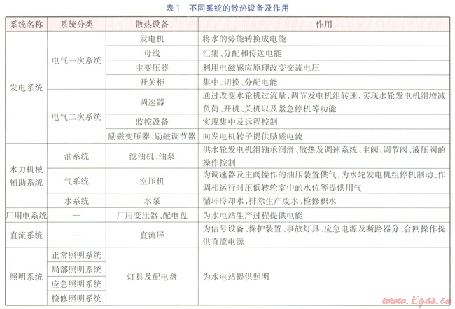 水電站發(fā)電工藝流程較復(fù)雜,涉及到的發(fā)電及配套輔助設(shè)備種類繁多,根據(jù)散熱設(shè)備的散熱機理及自身蓄熱特性,散熱設(shè)備可分為:重型水冷設(shè)備,蓄熱能力大,如發(fā)電機及水冷變壓器。重型風(fēng)冷設(shè)備,蓄熱能力較強,如母線、風(fēng)冷變壓器等。輕型風(fēng)冷設(shè)備,蓄熱能力小,如燈具、電氣盤柜、電機等設(shè)備。其中,重型水冷設(shè)備大部分散熱量由設(shè)備自帶的水冷卻系統(tǒng)帶走,其余散熱量散發(fā)到廠房空間,重型和輕型風(fēng)冷設(shè)備全部散熱量散發(fā)到廠房空 間同系統(tǒng)(發(fā)電系統(tǒng)、水力機械輔助系統(tǒng)、廠用電系統(tǒng)、直流系統(tǒng)、照明系統(tǒng)等[1-4])的散熱設(shè)備及作用見表1。