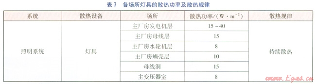 水電站廠房內(nèi)燈具一般使用熒光燈。燈具的散熱來源主要是電阻熱效應(yīng),通過對流及輻射方式將熱量傳到廠房空間。