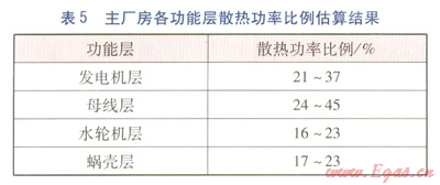 各洞室散熱功率比例估算結(jié)果見表4。由表4可知,母線洞的發(fā)電功率比例最大,主廠房與主變壓器接近。主廠房各功能層散熱功率比例估算結(jié)果見表5。由表5可知,母線層散熱功率比例最大,其次是發(fā)電機層,水輪機層與蝸殼層散熱功率比例接近且最小。