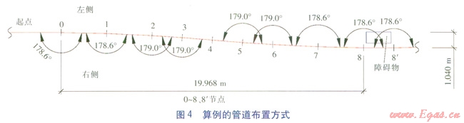 由圖4可知,在節(jié)點0位置管段0—1向右側(cè)偏轉(zhuǎn)1.4°,管段1—2、2—3、3—4繼續(xù)向右側(cè)偏轉(zhuǎn),管段4—5不再偏轉(zhuǎn)(即節(jié)點4的折角為0)。隨即,管段5—6向左側(cè)偏轉(zhuǎn)1.0°,管段6—7、7—8、8—8¢繼續(xù)向左側(cè)偏轉(zhuǎn),管段8—8¢為障礙物所在位置并與管道初始方向平行。采取以上布置方式,沿管道初始方向行進19.968m后,整體向右側(cè)偏移1.040m,繞過障礙物(即管段8—8¢所在位置)后,繼續(xù)行進19.968m重新回到原管位。求解過程中,管段最短長度為2m,最大實際折角為1.4°,滿足限制條件。