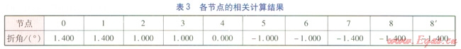 某直埋供熱管道規(guī)格為DN 1000mm,在敷設過程中遇到障礙物,要求在40m左右的距離內(nèi)偏移1m,之后管道需再調(diào)整回原管位。最大允許折角取1.4°,管段最短長度限定為1m。管道布置方式見圖4。由于管道基本以障礙物(管段8—8¢所在位置)為中心成對稱布置,因此圖4僅給出一側(cè)的管道。各節(jié)點、各管段的相關(guān)計算結(jié)果分別見表3、4。為方便表述,定義管段向右側(cè)偏轉(zhuǎn)時,折角為正值;向左側(cè)偏轉(zhuǎn)時,折角為負值。