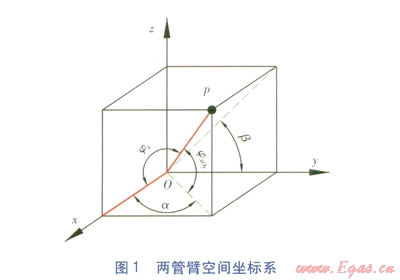 利用CAD軟件求解空間折角的優(yōu)勢是直觀、準確,但是需要較多步驟和計算機操作技巧。更重要的是,在許多情況下(如在施工現(xiàn)場等),無法提供給我們適合的計算機操作環(huán)境,只能通過手工計算求解。設定兩根管臂中的一根管臂所在直線為x軸,這樣我們只需計算出另一根管臂與x軸的夾角。兩管臂空間坐標系見圖1,一根管臂為x軸,另一個管臂(非x軸管臂)在xOy面(水平面)上的投影與x軸夾角為a,與xOy面夾角為jxOy,兩管臂空間折角為jx。