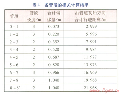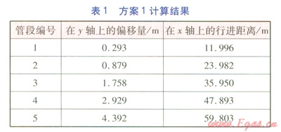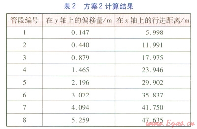 由表1、2可知,若實現(xiàn)0.879m的y軸上的偏移量,方案2在x軸上僅行進17.975m,而方案1需行進23.982m。這說明,采取縮短管段長度的方法,有利于在較短的行進距離內(nèi)實現(xiàn)較大的偏移量,從而順利避開障礙物。需要指出的是:在實際工程中,我們可以采取多實際折角與多管段長度相結(jié)合的處理方法,但焊縫數(shù)量不宜過多,以影響施工質(zhì)量。不應出現(xiàn)避讓開障礙物后,管道調(diào)整回原管位時出現(xiàn)實際折角大于最大允許折角的情況。