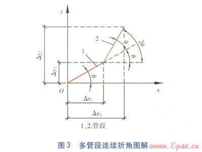設管段之間的最大允許折角(根據(jù)文獻[1]表8-1確定)為g,實際折角為q,且q≤g,每根管段的長度為L,沿管道初始方向為x軸,垂直于管道初始方向為y軸。多管段連續(xù)折角圖解見圖3。