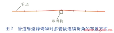 在直埋供熱管道的實際設計與施工中經(jīng)常遇到設計路由上有障礙物且無法移走的情況,因此管道必須局部改變方向(包括水平面、豎直面上的方向改變),避讓障礙物,通過后還需調(diào)整回原路由。由于現(xiàn)場這樣的情況非常多,因此若每遇到這種情況都采用預制彎管,一方面需要增加大量的預制彎管數(shù)量,使工程造價提高;另一方面,定制預制彎管的時間很長,延長了工期,這往往是不可行的。因此,實際工程中常采用多管段連續(xù)折角的方法處理。管躲避障礙物時多管段連續(xù)折角的布置方式見圖2。