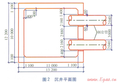 由式(6)可計(jì)算得,工作井長(zhǎng)度L為11m。工作井采用沉井法施工,沉井常見(jiàn)形式有圓形沉井、矩形沉井、腰圓形沉井、多邊形沉井等。其中矩形沉井底部平面布置靈活,利用率較高,且提供的后背反力比同規(guī)模的圓形沉井大,而且矩形沉井制作方便,施工模板可多次重復(fù)使用。由于該工程需頂進(jìn)平行的兩根鋼套管,所需后背反力較大,最終選取矩形沉井。沉井平面圖見(jiàn)圖2,圖中數(shù)值單位為mm。矩形沉井內(nèi)尺寸(長(zhǎng)×寬)為11.0m×10.0m,沉井壁厚為1.1m,下部底板附近的沉井壁厚增至1.2m。