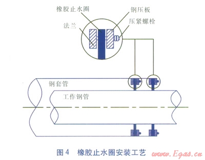 頂管結(jié)束后,在鋼套管端口焊接法蘭,用鋼壓板壓上兩道橡膠止水圈,封堵鋼套管與供熱管道之間的透水通道(見(jiàn)圖4)。并在鋼套管出口設(shè)置黏土截滲環(huán)(見(jiàn)圖l),黏土截滲環(huán)厚15m,其中7.5m包裹鋼套管,7.5m包裹出口供熱管道。