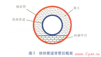 供熱管道穿管前,在鋼套管底部用磚砌成419mm高的平臺(tái),平臺(tái)表面抹灰,保證平臺(tái)表面平整。在平臺(tái)上鋪一層1mm厚的鍍鋅鋼板,在供熱管道外護(hù)層外包覆一層0.5mm厚的鍍鋅鋼板保護(hù)供熱管道。穿管結(jié)束后,供熱管道與鋼套管之間通過(guò)泥漿泵填充黏土,以保護(hù)供熱管道。供熱管道穿管后截面見(jiàn)圖3。