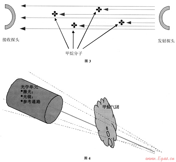 SELMA發(fā)射激光束(1.65μm-近紅外光):激光遇到物體后,漫反射光被光學單元內的拋物柱面鏡所收集,當激光遇到甲烷氣團。激光的能量被甲烷氣團吸收成為甲烷氣團的能量組成部分;較少的激光被反射回光學單元,使接收到的激光信號減弱;這種減弱會被專用軟件所處理。利用激光對甲烷具有極好的選擇性,收集激光在甲烷氣團中的散射光,通過軟件的算法,實現(xiàn)甲烷的濃度峰值的計算,同時避免了其它碳氫化合物的干擾。如汽車尾氣等。見圖4。