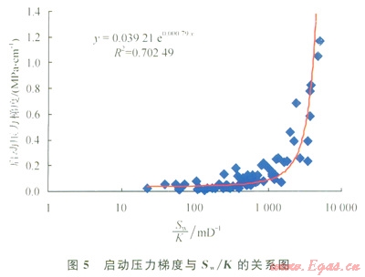 巖石孔隙介質(zhì)中,由于氣水潤濕性的差異和毛細(xì)管壓力的作用,水優(yōu)先占據(jù)小孔喉和孔隙壁面,并且由于氣體的易壓縮性,其在含水的孔隙中流動時,首先選擇大的孔隙,隨著流動壓差的增大,逐漸驅(qū)動小一些吼道的水或使孔隙壁面的水膜變薄,在未形成連續(xù)氣流的孔喉處氣體前沿呈跳躍式前行,且容易被水卡斷[17],這就是氣體在含水孔隙介質(zhì)中流動存在啟動壓力梯度的微觀機(jī)理。表現(xiàn)在滲流曲線上,流量與壓差并不呈線性關(guān)系,通過數(shù)據(jù)擬合可以求出不同含水飽和度時的啟動壓力,除以巖樣長度即為啟動壓力梯度,將全部巖樣的實驗數(shù)據(jù)繪于同一圖上(圖4),發(fā)現(xiàn)啟動壓力梯度隨含水飽和度增大而增大,且?guī)r樣滲透率越小,這種趨勢越明顯,當(dāng)含水飽和度大于50%以后,啟動壓力梯度明顯增大。進(jìn)一步通過數(shù)據(jù)分析發(fā)現(xiàn),啟動壓力梯度與含水飽和度和滲透率的比值(Sw/K)具有很好的相關(guān)性(圖5),呈以下的指數(shù)函數(shù)關(guān)系: