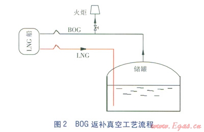 LNG船在向儲(chǔ)罐卸裝液體時(shí),由于液體流出而產(chǎn)生真空,增加了液體卸裝的阻力,極大地增加了耗能,甚至使LNG船上的液體無(wú)法完全卸入罐內(nèi)。因此,LNG接收站接收LNG時(shí),需要及時(shí)填補(bǔ)LNG船艙由于液體流出所形成的真空。如采用其他氣體返補(bǔ)真空,既會(huì)引入新的雜質(zhì),又會(huì)造成熱量大量流入,加速LNG氣化。而LNG儲(chǔ)罐中產(chǎn)生的BOG溫度大約在-140~150℃,將BOG通過(guò)氣體返回線流回船艙填補(bǔ)真空,可以很好地避免上述問(wèn)題。同時(shí)在BOG返回船艙時(shí),船艙內(nèi)大量LNG提供的冷量使得BOG重新液化,在一定程度上回收了BOG[7]。BOG返補(bǔ)真空工藝流程見(jiàn)圖2。
