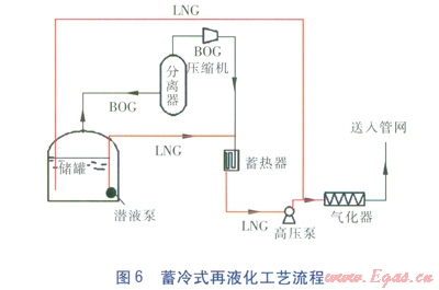 為了克服LNG夜間外輸量小導(dǎo)致所提供的冷量不足以將BOG再液化的問(wèn)題,在以上基礎(chǔ)上發(fā)展了蓄冷式再液化工藝,流程見(jiàn)圖6。